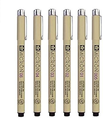 As canetas Pigma Micron da Sakura são canetas nanquim do tipo técnica, ideais para quem faz desenho técnico ou trabalhos que precisam de finalizações precisas e detalhadas, mas é também indicada para quem trabalha com escrita. Vem em um kit de 6 canetas, com pontas de metal longo de espessuras variadas entre 0.005mm e 0.8mm. Assim, o usuário possui uma ótima variedade de traçados mais finos e mais grossos.