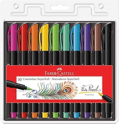 As canetas Super-Soft Brush da Faber-Castell são canetas tipo pincel, excelentes para quem trabalha com colorações ou técnicas como lettering e outros desenhos artísticos. Vem em um kit com 10 canetas nas cores rosa, vermelha, laranja, amarelo, verde, azul, violeta, marrom e preto, garantindo bastante variedade e cores vibrantes para os seus desenhos.