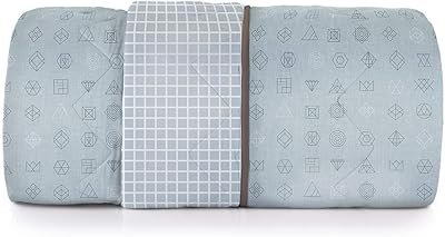 Ideal para pessoas que dormem sozinhas, o edredom mede 1,70 de largura por 2,40 m de comprimento. Em relação à estampa, o cobertor é do tipo dupla face com um lado cinza e figuras geométricas e do outro formas quadriculadas. Assim, você terá liberdade para escolher a estampa que mais combinar com a decoração do quarto.